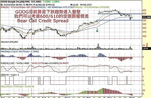 我們原本11月有建議做出GOOG 550/540的多頭賣權價差策略 (Bull Put Credit Spread), 因為GOOG現在線形屬弱勢,我建議保守的你可以先平盤出場. 但是如果你與我一樣比較能承擔風險與看好接下來2個禮拜GOOG可能進入盤整, 我建議你關一半, 然後將那一半換來開GOOG 600/610的空頭買權價差策略 (Bear Call Credit Spread). 這樣的好處是, 你已經降低你一半的風險, 也不用擔心GOOG再次拉回下探$550價位, 只要GOOG在12月選擇權到期前股價在$550與$600之間, 我們上下是都可以達到獲利的~